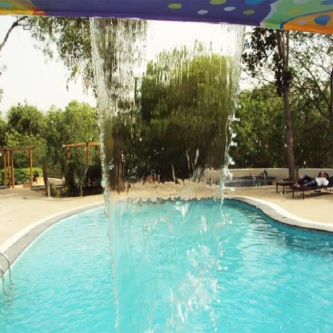 Designer pool with water sheet, constructed from concrete, vinyl, and fiberglass. Made in India for hotels and resorts. Electrical power requirement.
