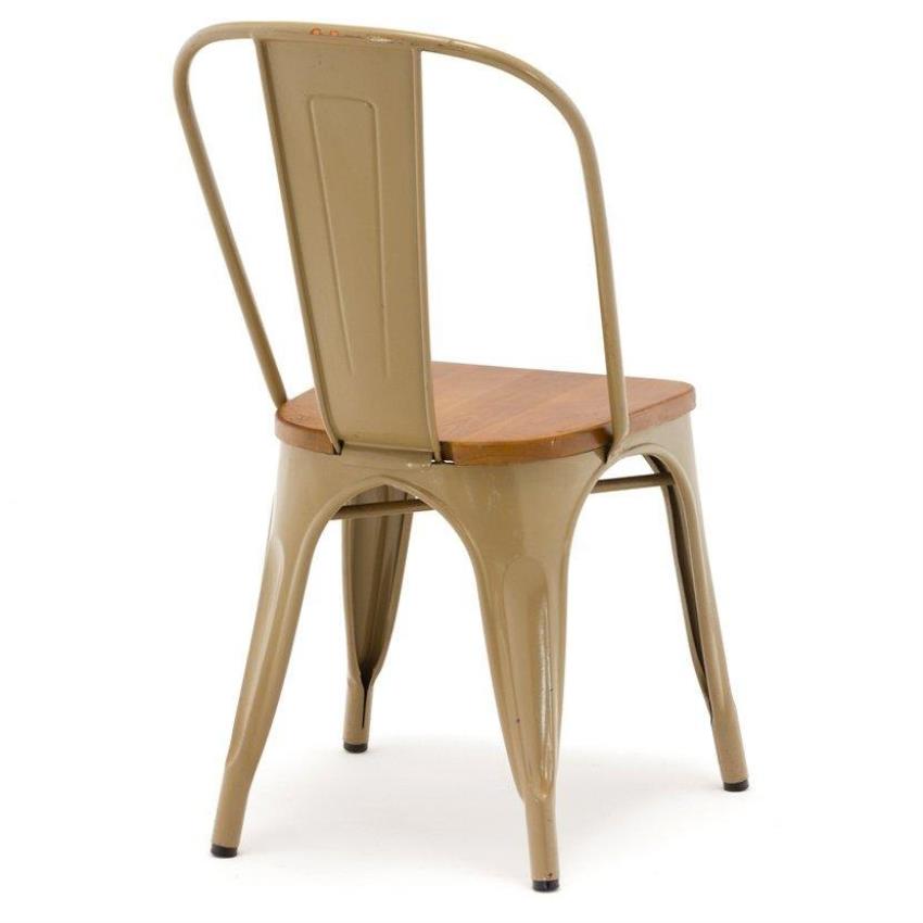 Brown, non-folded restaurant chair with a stainless steel body and plastic seat. Features 4 legs and a standard design.