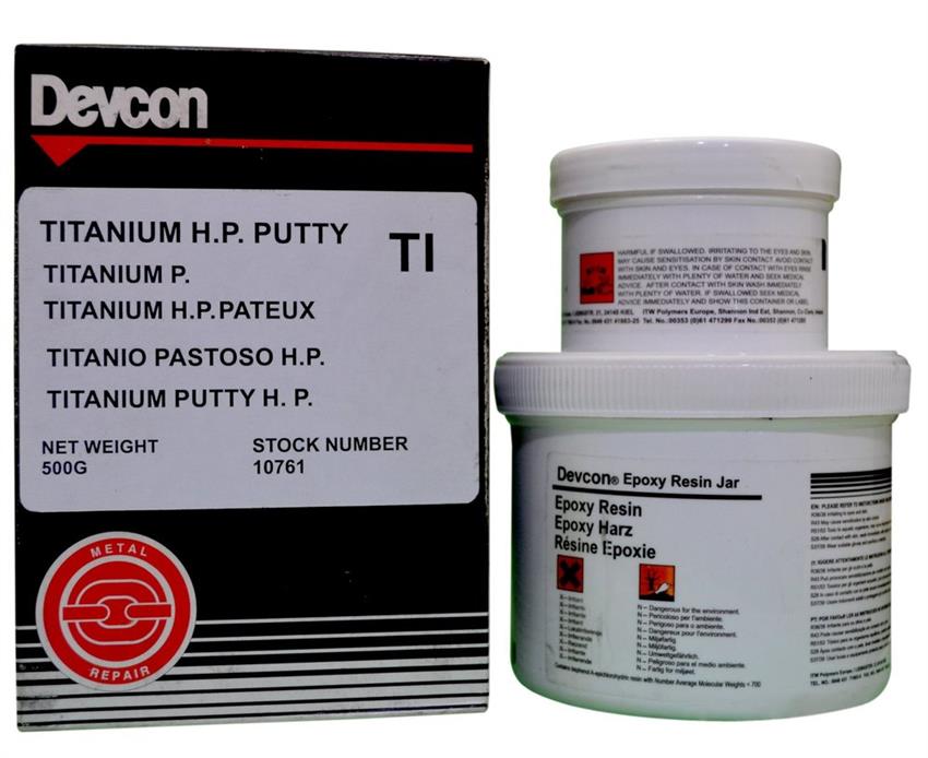 Industrial grade grey titanium putty, 0.5 kg package. Moisture resistant, cures to 2.36 gm/cc density. Suitable for plastic surfaces, providing 843 cm2/kg coverage at 5mm.
