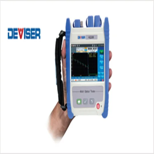 Deviser AE2100A OTDR for OFC maintenance work. Features >29dB dynamic range and a 5-inch 800x480 TFT touch screen.