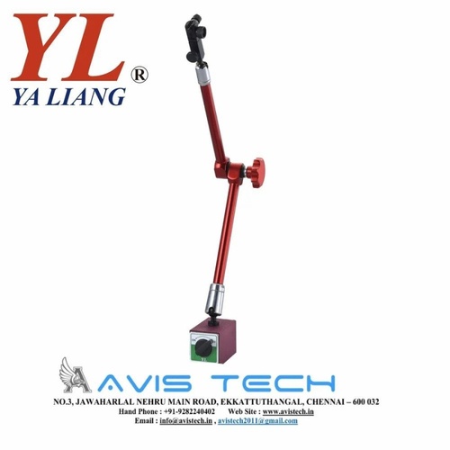Universal dial magnetic stand made of mild steel, designed for versatile applications. This Taiwan-made equipment provides a stable base for measurement tools.