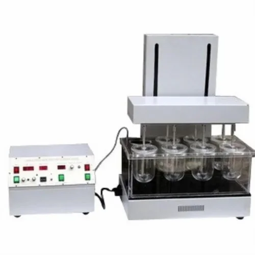 Automatic 14-station dissolution testing machine with digital display. Features 500W heater, 24V motor, and 999-minute timer. Operates on 230V/50Hz power. Packaged in a wooden box.
