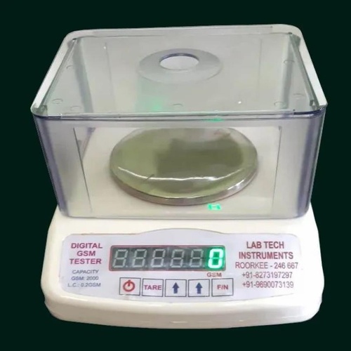Digital GSM meter with 8x8x10 inch platform. Measures up to 2000 GSM, powered by 220V AC. Electric power source for reliable operation.