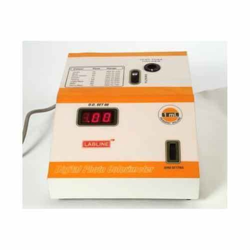 Compact digital colorimeter with 2-digit LED display. Measures 0-100% Transmittance and 0-2 Absorption (O.D.). Requires 230V AC, 50 Hz. Includes 5 test tubes and dust cover.