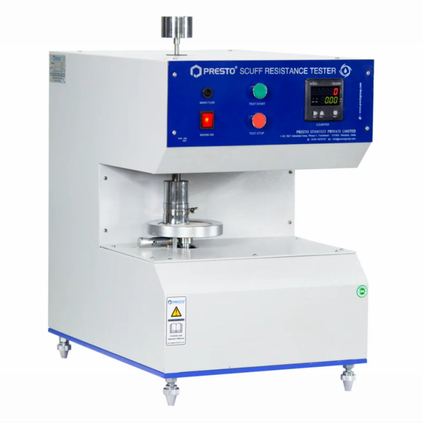 Digital PSR-292 Scuff Resistance Tester made of mild steel. Operates at 60 rpm rotational speed with a safety lock mechanism. Features a digital display for clear readings.