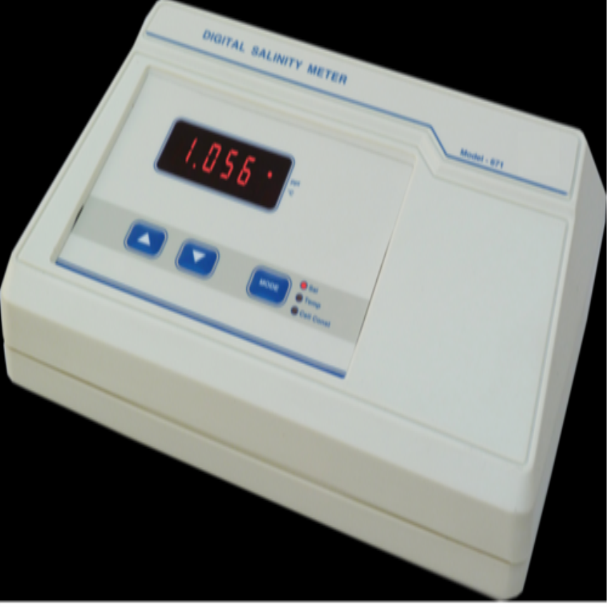 Laboratory digital salinity measuring machine, model SSE-SSE-671. Offers 2-50 ppt range, 0.001 ppt to 1 ppm resolution, and 230V power.