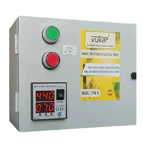 Three phase digital DOL auto motor starter panel board for borewell pumps. Includes dry run, overload, voltage protection, cyclic timer, and inbuilt auto switch (TPM-A).