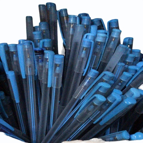 Disposable plastic ball pen with blue ink. Ideal for bulk promotional use. Features durable plastic construction. Made in India. Minimum order quantity applies.
