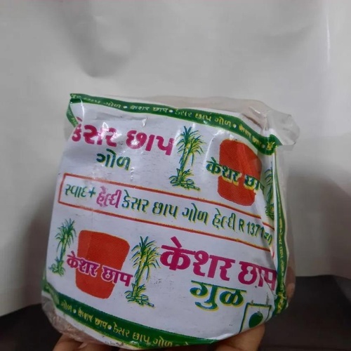 Organic Kesar jaggery, naturally processed into a round ball shape. Ideal for traditional Indian sweets and cooking. Packaged for freshness.