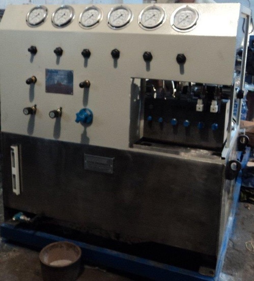 Automatic hydraulic test rig made of stainless steel for industrial use. Operates hydraulically with an operating pressure up to 700 Bar.
