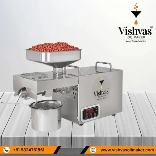 Domestic expeller oil machine for multi-seed extraction. Features 600 Watts power, SS304 body, and automatic operation. Capacity up to 1 ton/day.