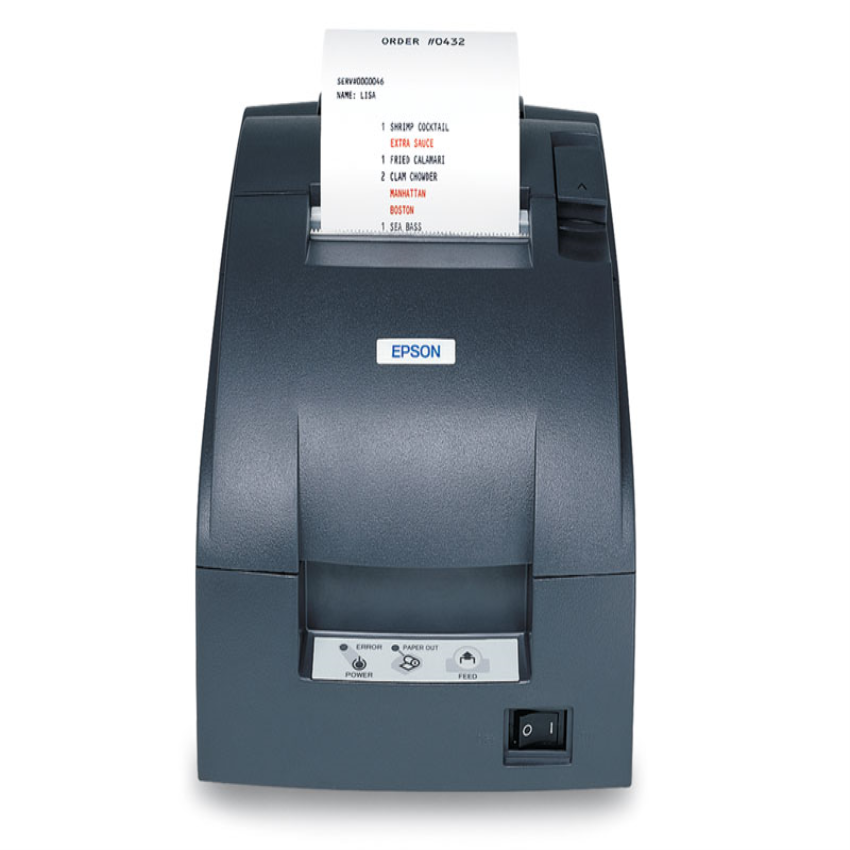 Monochrome dot matrix printer, model Tm-U220. Supports 3-inch paper size and features an auto cutter. New condition, designed for black and white output.