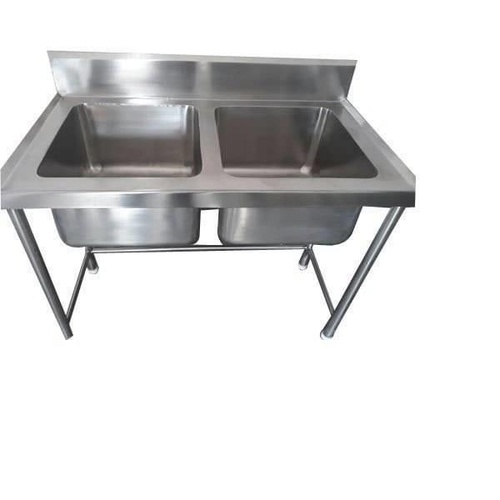 Double bowl kitchen sink made of stainless steel. Available in SS202 and SS304 grades, with a thickness of 8-10 mm. Designed for efficient dishwashing and food preparation.
