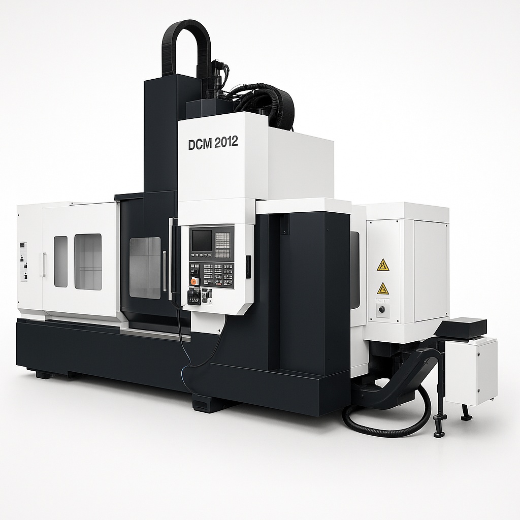 Double column VMC DCM 2012 milling machine for industrial applications. Features 6000 RPM spindle speed and 750mm Z-axis travel. Vertical layout.