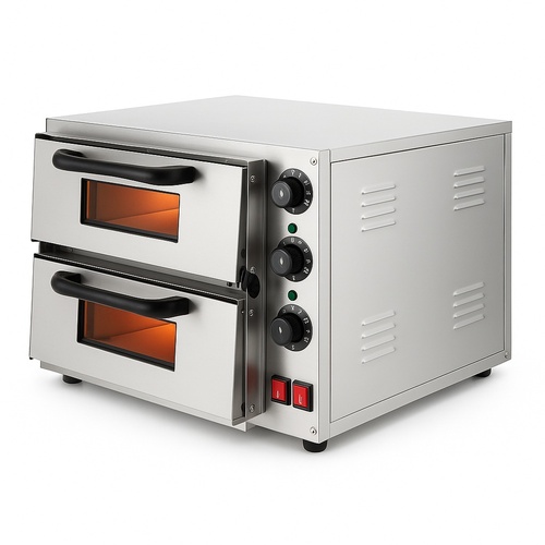 Commercial stainless steel pizza oven with double baking chamber (16x16 inches). Features 3 KW power and electrical power supply for efficient operation.