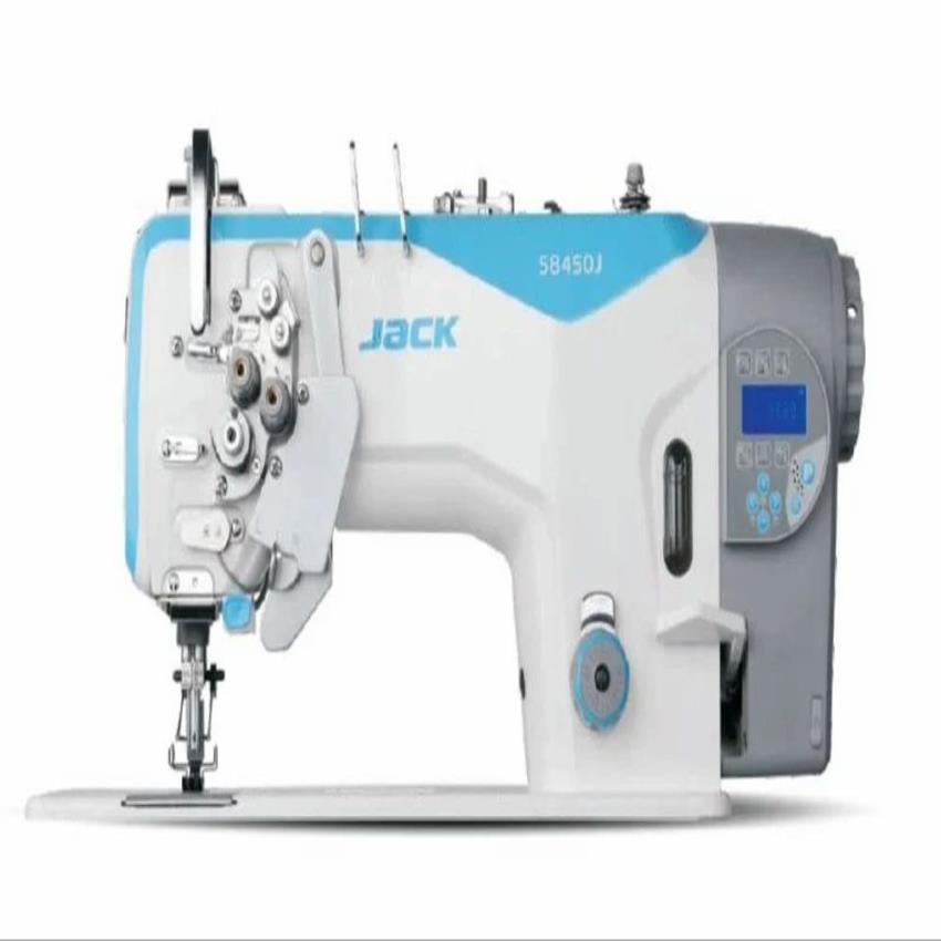 Semi-automatic double needle lockstitch sewing machine. Model number/name: Jack 58450J. Designed for efficient fabric stitching and seam construction in various apparel applications.