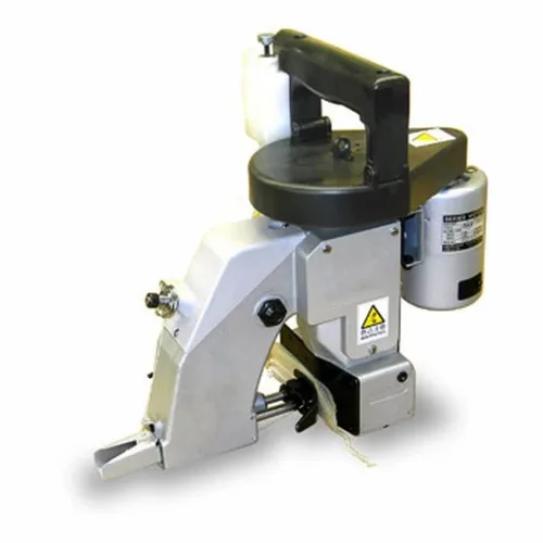 Double needle portable bag closer sewing machine, 6.5kg net weight. Features 1800 stitch/min, 7mm max stitch length, and 220 VAC power.