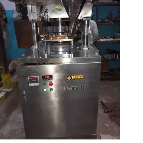 Automatic double rotary tablet machine made in India from SS material. Produces up to 86400 tablets/hr, with 3 HP power and 415 V voltage. Max tablet diameter 16 mm.