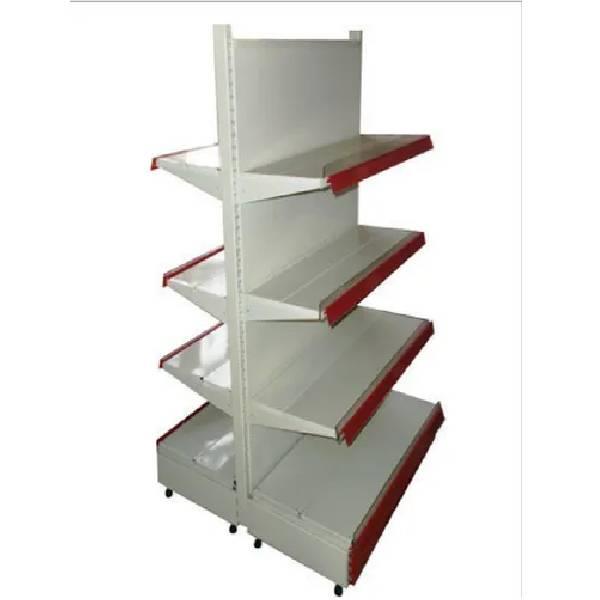 A 6-foot tall, double-sided free-standing display rack made of mild steel. Features 4 shelves with a substantial 200 Kg weight tolerance capacity.