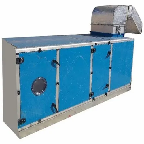 This double skin air handling machine features 20000 CFM capacity and MS casing. It includes a control panel for operation. Floor stand mounting and 120 dBA noise level.