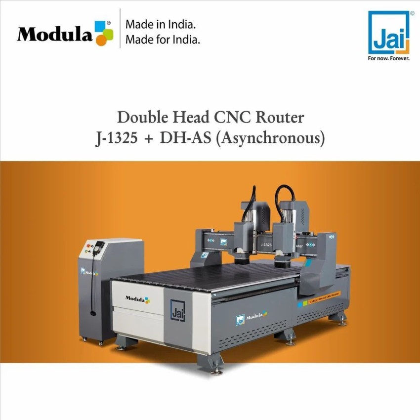 New J-1325 (DH-AS) double spindle wood cutting machine with 3.5 kW spindles at 18000 RPM. Features DSP A11E control, 1300x2500 mm working area, and 25000 mm/min cutting speed.