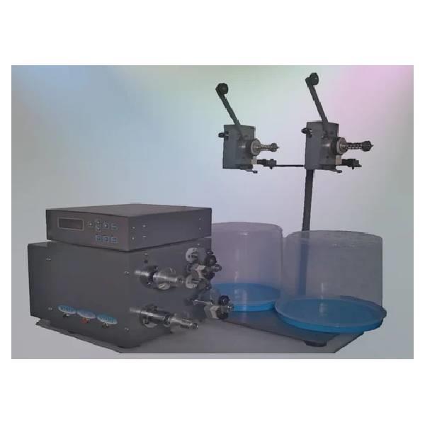 Two spindles coil winding machine with microcontroller and 10mm pitch screw rod. Features EEPROMS for 100 programs, 4-line LCD, and normal keyboard interface.