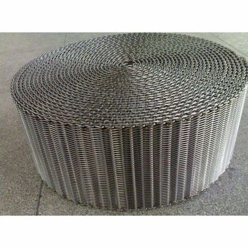 Corrosion-resistant steel wire mesh conveyor belt, highly durable for industrial applications. Available in widths ranging from 10 to 20 inches.