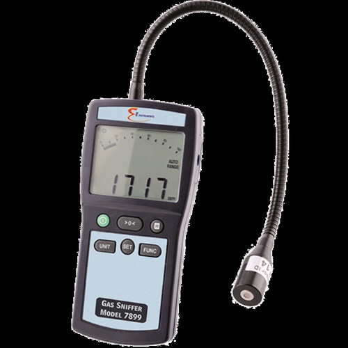 Portable E-instrument 7899 gas sniffer with digital display. Compact dimensions of 15 x 4.5 x 10 cm and weight up to 500 gm. Packaged in a box.
