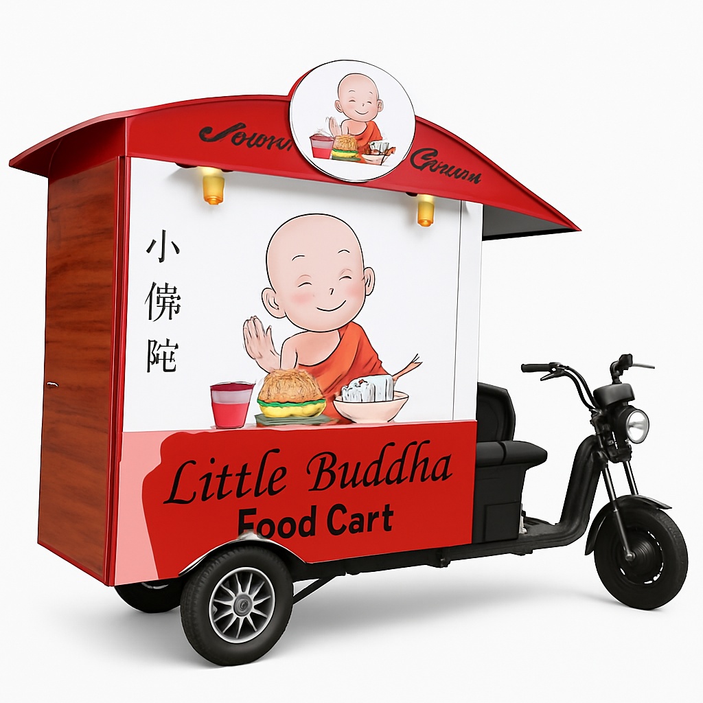 Electric rickshaw based food cart. Designed for mobile food business with electric power. Offers convenient food vending solutions.