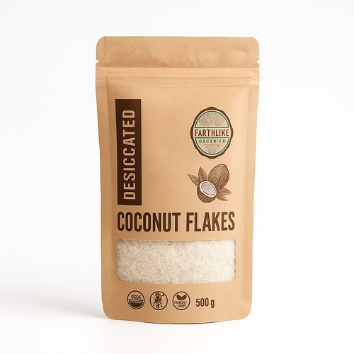 Desiccated coconut flakes, 500gm pack. Made in India, with a 6-month shelf life. Ideal for cooking and baking applications.