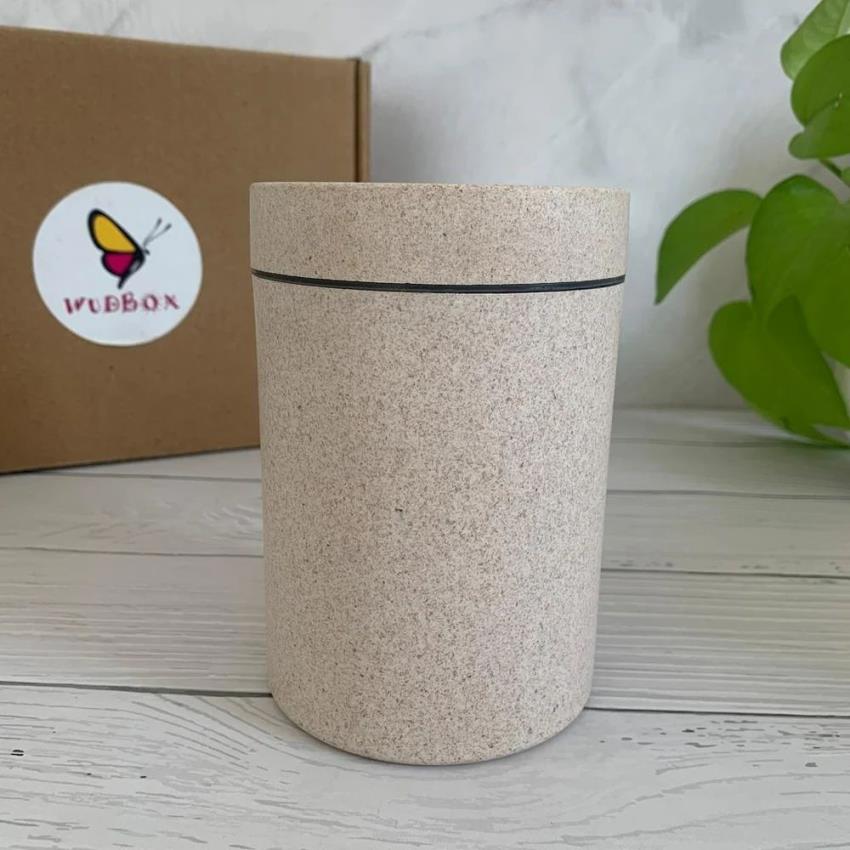 Eco-friendly rice husk canister with lid. Capacity over 360ml. Features a natural pattern print. Bottom diameter >3 Inch, top diameter 4 Inch, 6 Inch height.