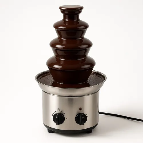 Stainless steel chocolate fountain machine with 10L capacity. Dimensions 33x60cm, powered by 600W for efficient chocolate flow.