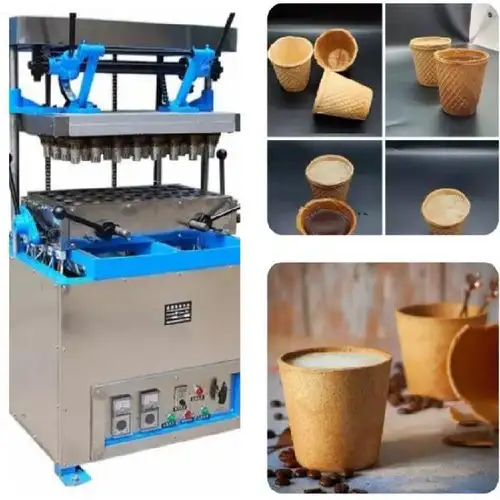 Edible cup machine PUE-32. Manual operation, 800-1000 cups/h capacity, 2-3 min baking time. Produces 32 cups per batch.