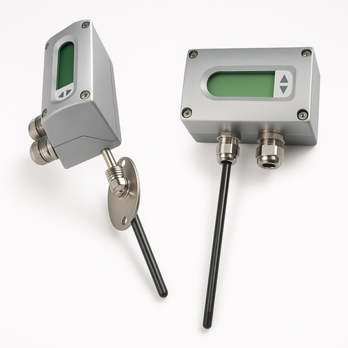 This EE75 Series transmitter measures air velocity up to 40 m/s and temperature from 40 to 120 deg C. Features adjustable 0-10V or 4-20mA output. Accuracy is +/- 0.2m/s 3% mv.