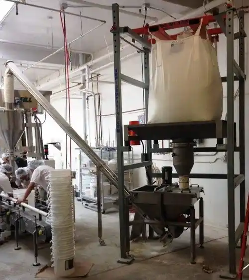 Industrial electric bulk bag unloader with 2 HP power, 415 V, 50 Hz. Mild steel construction, 12 Ton/hr capacity. Features 40 ft max lifting height and 2m x 2m platform.