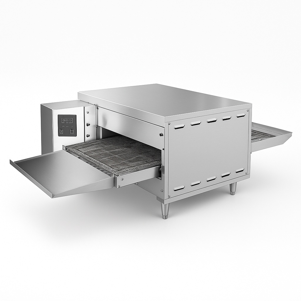 Automatic stainless steel electric conveyor oven 520 E. Commercial grade, measuring 1069mm wide x 966mm deep x 552mm high. Suitable for pizza, biscuits, cookies, bread, and buns.