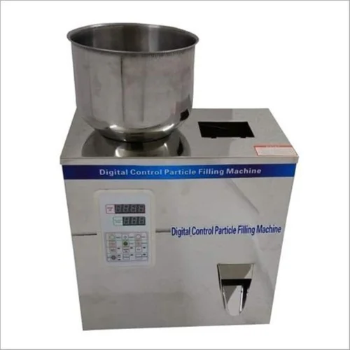 Semi-automatic electric driven granular filler. Stainless steel construction with one filling head. Capacity ranges from 0-500 pouches per hour.