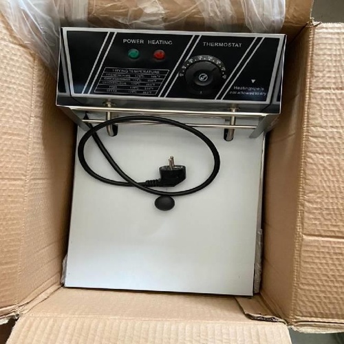 Compact electric fryer device for commercial use. Simple operation and durable design, ideal for fast-paced food preparation.