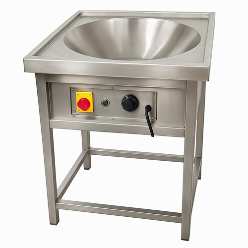 Electric kadai with a 20-liter capacity, includes a stand. Dimensions are 31x32x31, with a 1-year warranty. Weighs 29 Kg, ideal for food service operations.