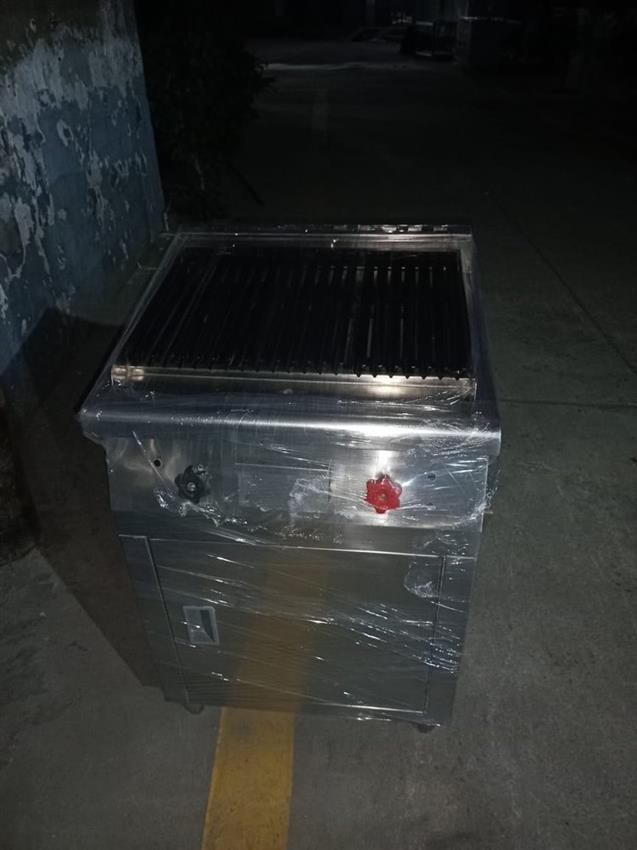 Stainless steel electric lava rock grill with cabinet. Features 2 burners, 17 KW power, and 380 V voltage. Grid size is 734x590 mm. Dimensions are 800x900x920 mm.