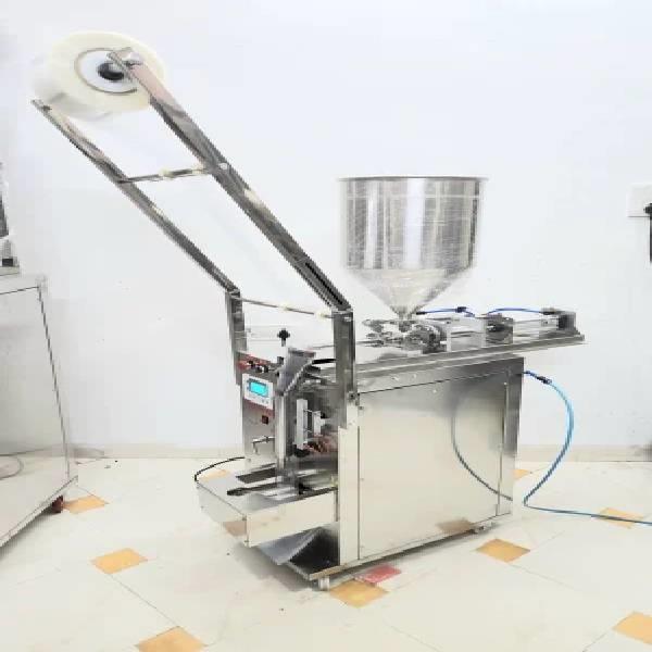 Automatic electric liquid pouch packing machine manufactured in India. Features a production capacity of 500 pouches/hour with 1kW power consumption. Box packaging type.