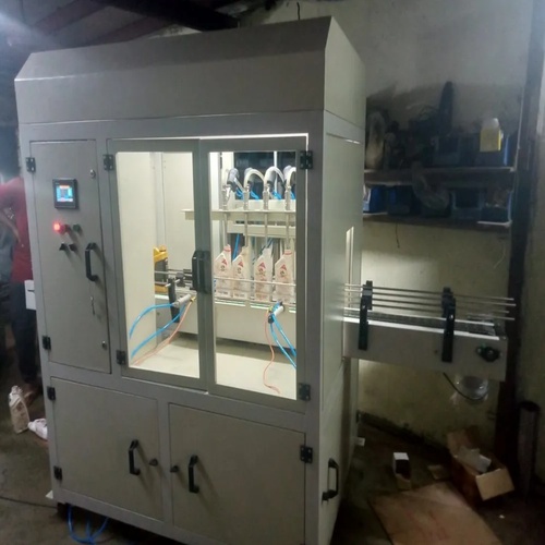 Automatic electric lube oil filling machine with 4 heads and 6 pipes. Features a 3m pipe length, 50-10000ml filling range, and 1ml filling accuracy.
