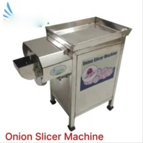 Stainless steel electric onion slicer with a 0.5 HP motor. Processes 150 kg/hour. Runs on 230V. Suitable for potatoes and carrots too. Made in India.