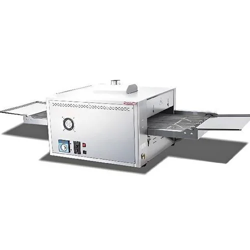 Electric conveyor oven designed for pizza baking. Features an efficient conveyor system for continuous operation. Compact design suitable for commercial kitchens.