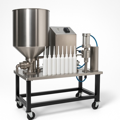 Semi-automatic electric grease filling machine, stainless steel. 1 HP power, 0-500 pouch/hr capacity. Handles cartridges, pouches, containers with 60L hopper.