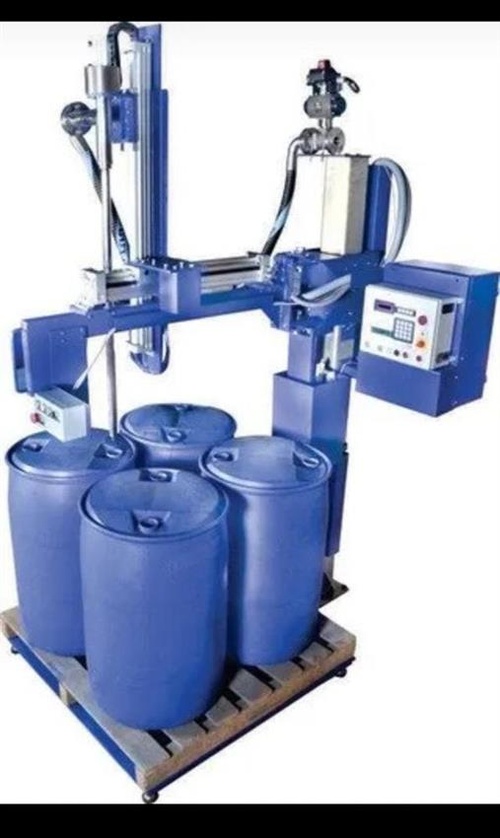 Industrial electric semi-automatic pallet drum filler made of stainless steel. Offers high capacity of 70-75 drums per hour for efficient liquid filling operations.