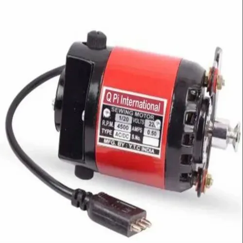Indian-made electric sewing machine motor. 1/20 H.P, 220V, 50Hz, 4500 RPM. Features aluminum construction with coated surface finish.