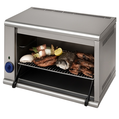 Silver electric salamander, 12x40x20cm. Features rust-free stainless steel construction, 50 Hz frequency, and 240V single-phase power. Suitable for hotel applications.