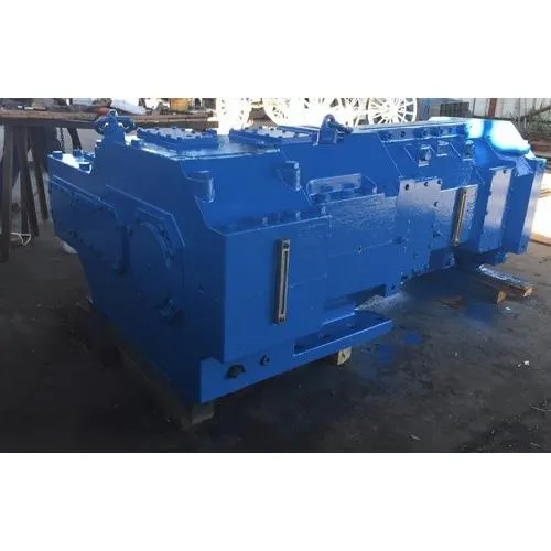 Horizontal three-phase electric twin extruder gearbox. Constructed from cast iron with a color-coated surface treatment. Designed for industrial extrusion processes.