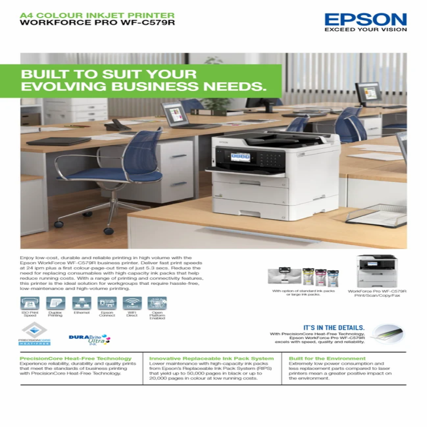 Epson C579R printer offers color/B&W output, A3/A4 paper size, 24 IPM print speed, and wireless connectivity. Includes a 1-year warranty.